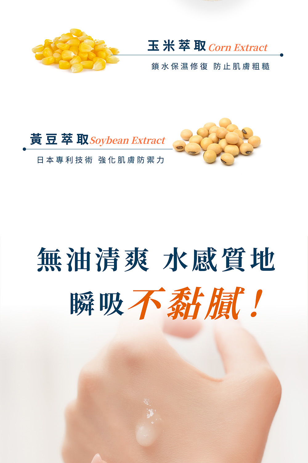 |迅速吸收|不含油脂,水溶性質地,清爽不黏膩,吸收快速